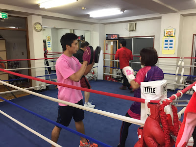 リング内では、ピンクのASB T-シャツを来た、タムタムこと、田村さんがミットを持っています。
