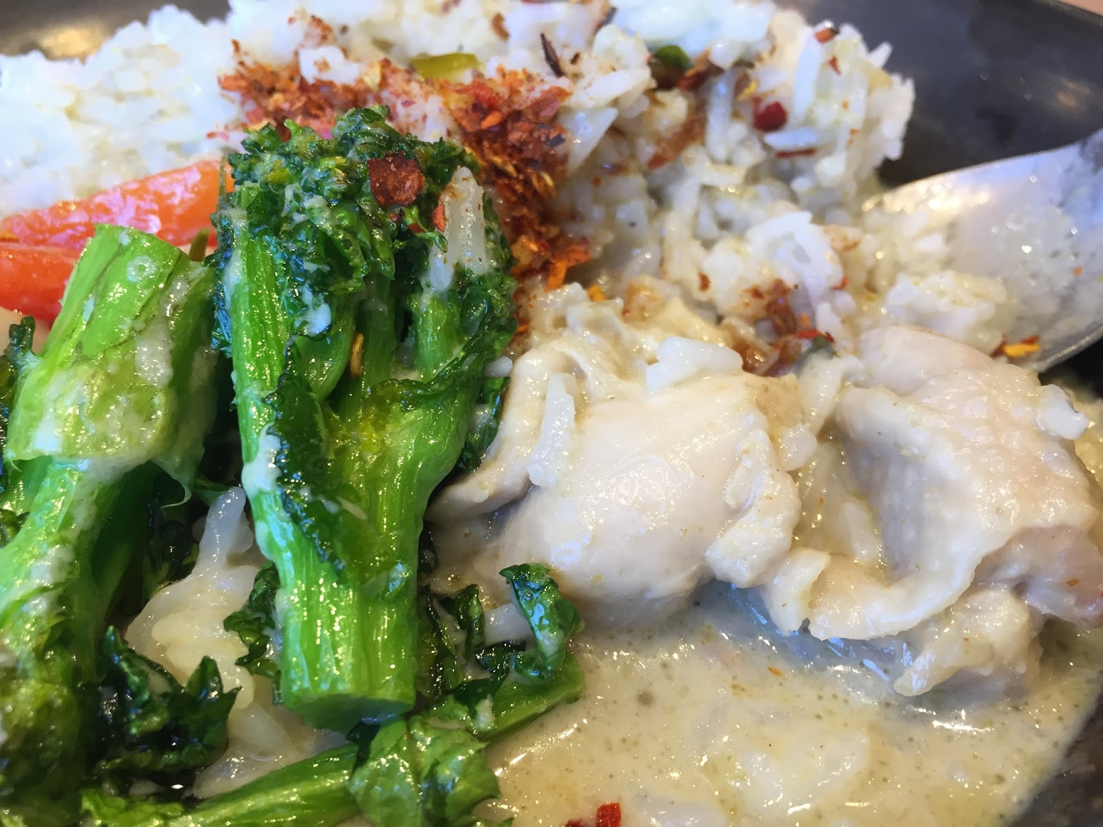 グリーンカレーのチキン、野菜と一緒に頂きます。
